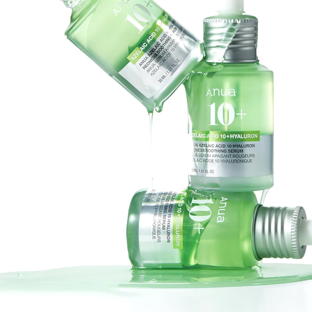 ANUA Azelaic Acid 10 Hyaluron Redness Soothing Serum - raminamasis veido serumas, skirtas paraudimo mažinimui, odos būklės balansavimui ir intensyviam drėkinimui. Serumas tinka normaliai, jautriai ir į paraudimą linkusiai odai, taip pat odai su netolygiu tonu.