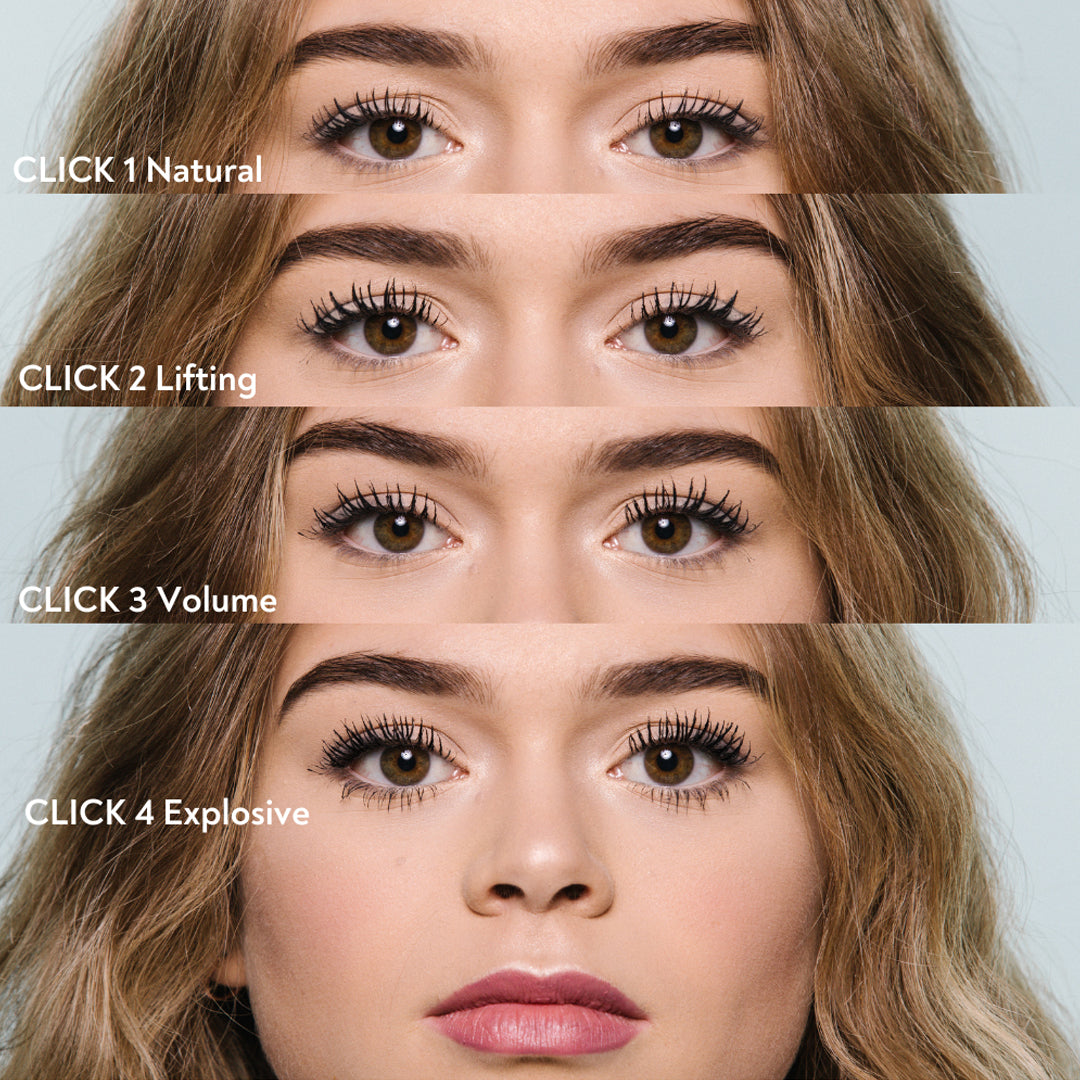 BLONDESISTER Click&Turn Mascara – tai pirmasis 4-in-1 blakstienų tušas, kuris leidžia vienu paspaudimu pasirinkti efektą – nuo natūralaus iki sprogstamo! Inovatyvus, reguliuojamas šepetėlis keičia formą kiekvienu „Click & Turn“!