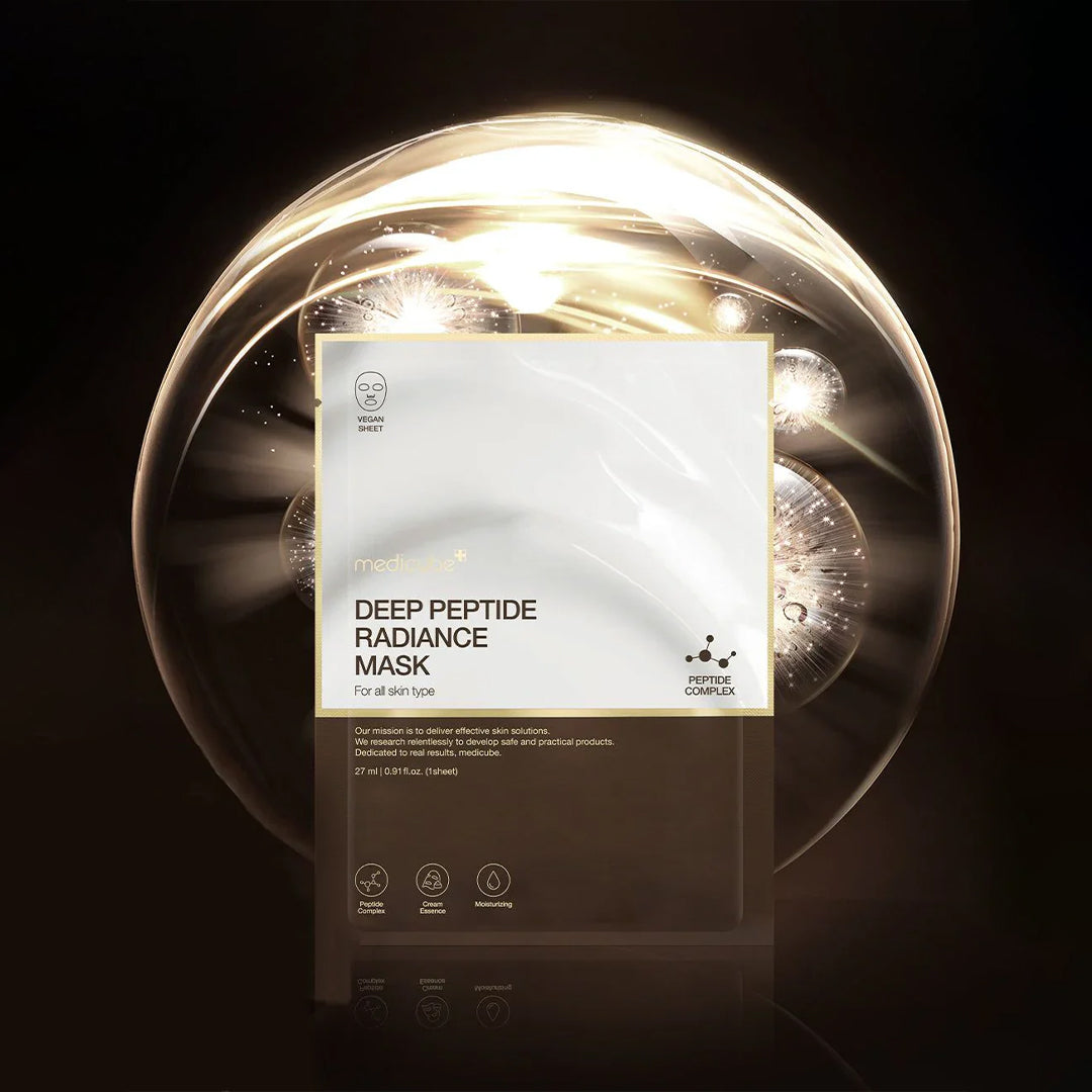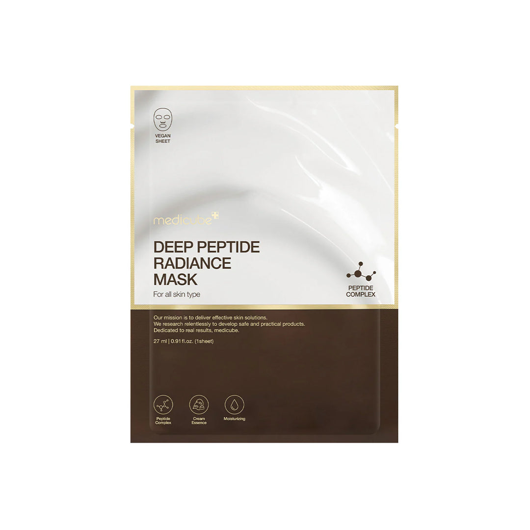 MEDICUBE Deep Peptide Radiance Mask - lakštinė veido kaukė, skirta odos skaistinimui, stangrinimui ir intensyviam drėkinimui. Sudėtyje esantis peptidų kompleksas padeda gerinti odos elastingumą ir glotnumą, o niacinamidas suvienodina odos toną bei suteikia jai natūralaus švytėjimo. Hialurono rūgštis ir pantenolis užtikrina ilgalaikį drėkinimą bei ramina sudirgusią odą.